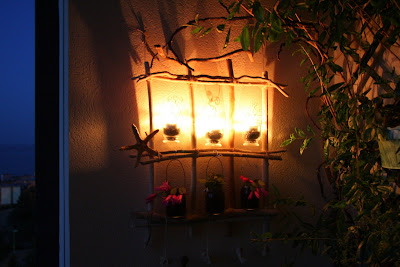 Bellissima l'idea di appendere candele e vasetti: il tocco del ferro lavorato, la candela colorata abbinata al fiore, conchiglie e stelle...è tutto molto piacevole e suggestivo.